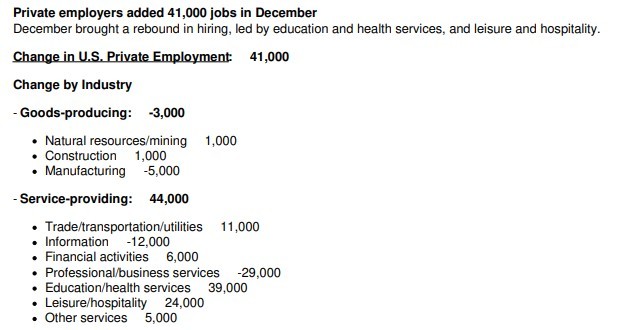 Private sector job creation turned positive in December but came in at a softer pace than expected, according to the ADP National Employment Report released Wednesday. U.S. private employers added 41,000 jobs for the month, reversing a revised loss of 29,000 in November, but falling short of the Dow Jones consensus estimate of 48,000.