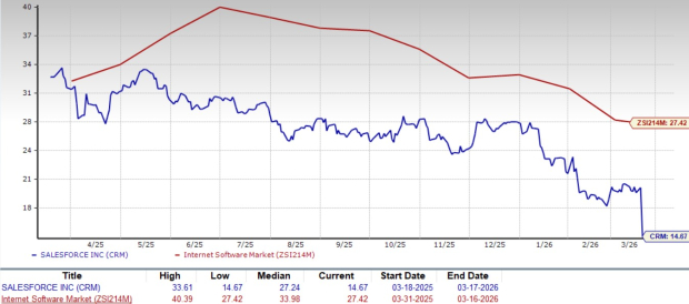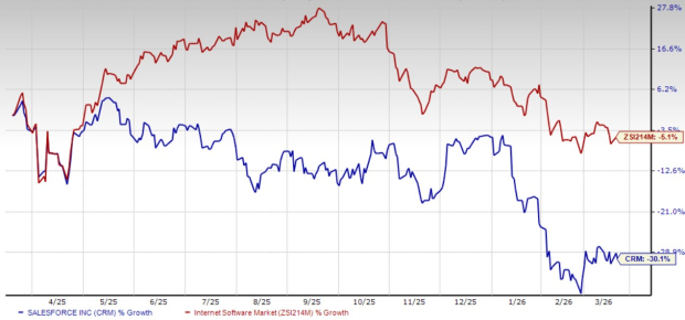 Shares of Salesforce have plunged 30.1% over the past year compared with the Zacks Internet – Software industry’s decline of 5.1%.