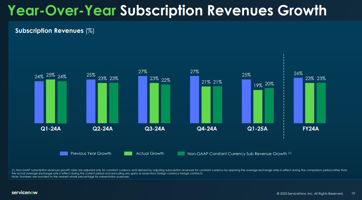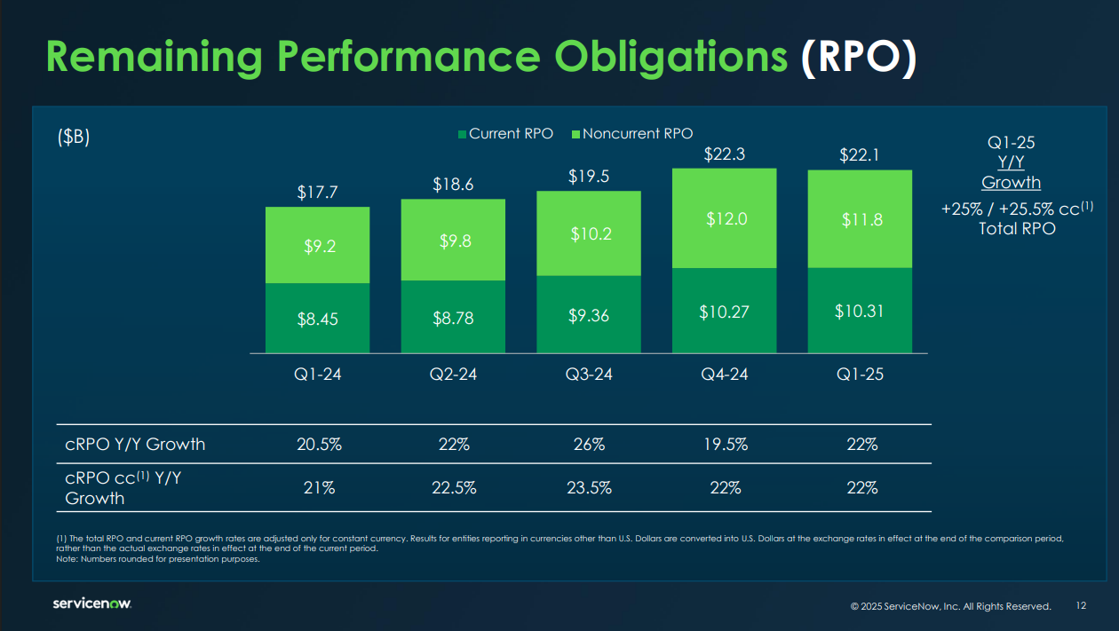 cRPO has increasingly become a critical benchmark for gauging the forward momentum of recurring software revenue businesses like ServiceNow. It captures signed but unrecognized subscription revenue over the coming year, offering investors a near-term demand signal. The 22% YoY growth in cRPO exceeded the company’s own forecast by 250 basis points and 150 bps on a constant currency basis. Importantly, ServiceNow also guided Q2 cRPO to grow 19.5%, reinforcing visibility into sustained demand.