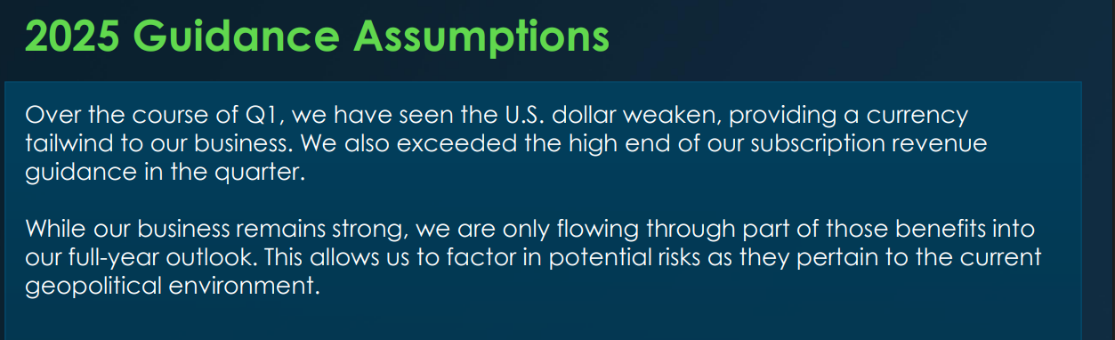 Looking ahead, ServiceNow maintained its full-year 2025 subscription revenue forecast of $12.64–$12.68 billion (19% growth in constant currency), versus the Street’s $12.66 billion. For Q2, it expects subscription revenue of $3.03–$3.04 billion, slightly ahead of the $3.02 billion consensus. Importantly, management also reiterated its cRPO guidance for 19.5% YoY growth in Q2.