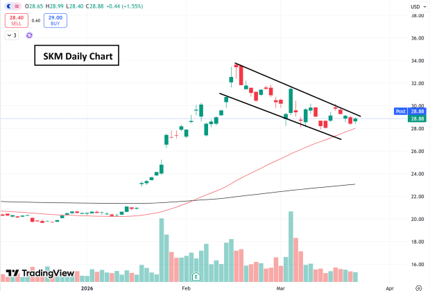SKM shares currently offer investors a juicy reward-to-risk setup as they pull back uniformly to the rising 50-day moving average.