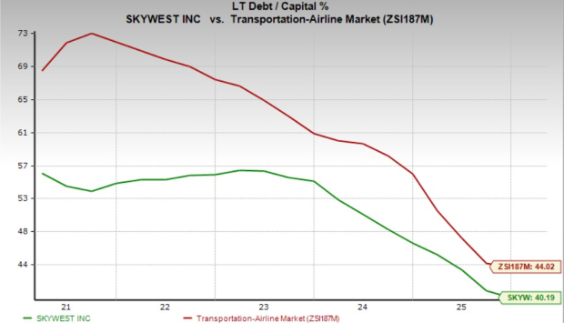 SkyWest’s solid balance sheet increases financial flexibility. The company ended fourth-quarter 2025 with cash and marketable securities of $706.9 million, higher than the current debt level of $546.81 million. This implies that the company has sufficient cash to meet its current debt obligations. Meanwhile, the long-term debt level has decreased to $1.84 billion (which translates into a debt-to-capitalization of 46.6%) at the end of fourth-quarter 2025 from $2.14 billion (which translates into a debt-to-capitalization of 52.6%) at the end of fourth-quarter 2024.