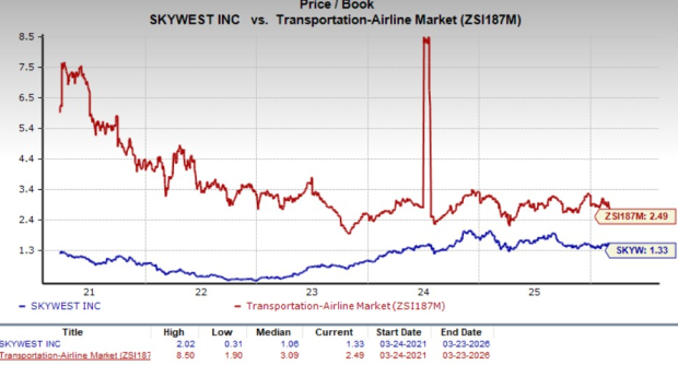 SkyWest looks cheap from a valuation standpoint. Considering the trailing 12-month price-to-book (P/B)ratio, SkyWest is trading at a discount compared to the industry.