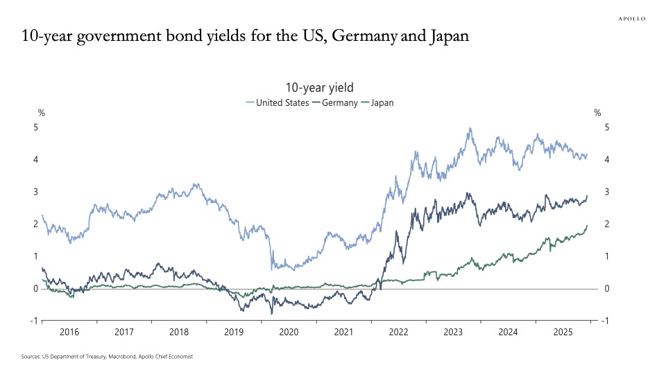 at a 4.3% annualized rate in the third quarter of 2025, accelerating from 3.8% in the prior quarter, driven by stronger consumer spending, exports, and government outlays.Still, longer-term risks remain tied to interest rates. Torsten Slok, chief economist at Apollo Global Management, said fiscal and inflation concerns are keeping upward pressure on long-term yields across major economies, warning that rates are likely to remain “higher for longer,” a backdrop that continues to weigh on equity valuations.
