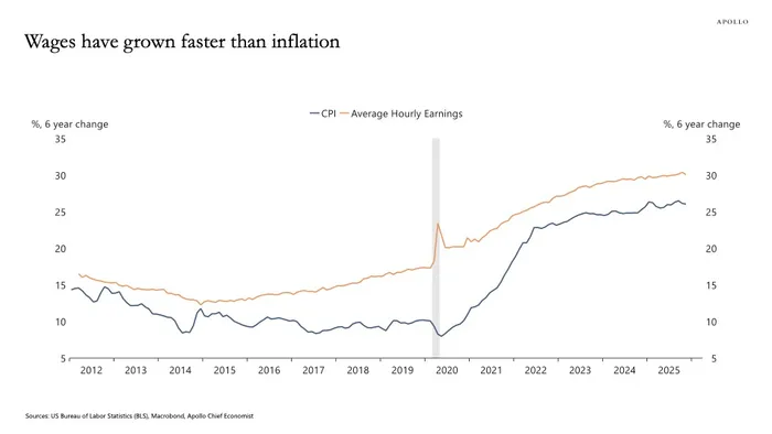 Torsten Slok, chief economist at Apollo Global Management, noted that while the consumer-price index’s price level has increased 26% since 2019, wages have increased 30%, a comparison that can shape the market’s broader view of affordability and purchasing power.