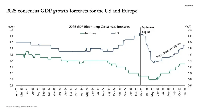 Against this uncertain policy backdrop, forecasts for 2025 have already tracked the ebb and flow of this year’s trade war. As Apollo Chief Economist Torsten Slok noted, consensus GDP expectations fell sharply after the conflict escalated in March but have been recovering steadily since the summer as trade deals were signed across multiple partners.