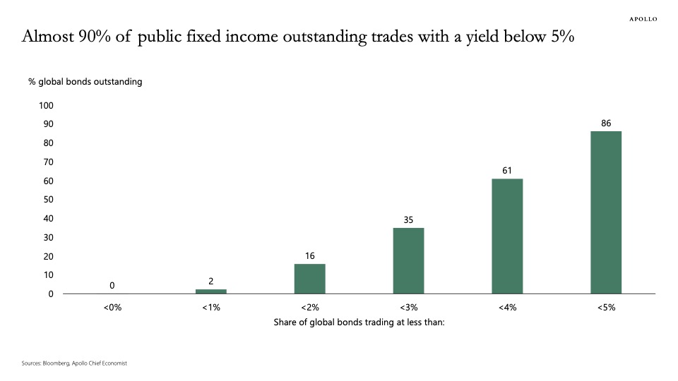 The rate backdrop remains unusually benign for risk assets. A chart circulated by the Apollo Chief Economist using Bloomberg data shows “almost 90% of public fixed income outstanding trades with a yield below 5%,” underscoring how a vast share of the global bond market still sits under that level. Lower nominal yields, all else equal, tend to bolster equity valuations by reducing discount rates.