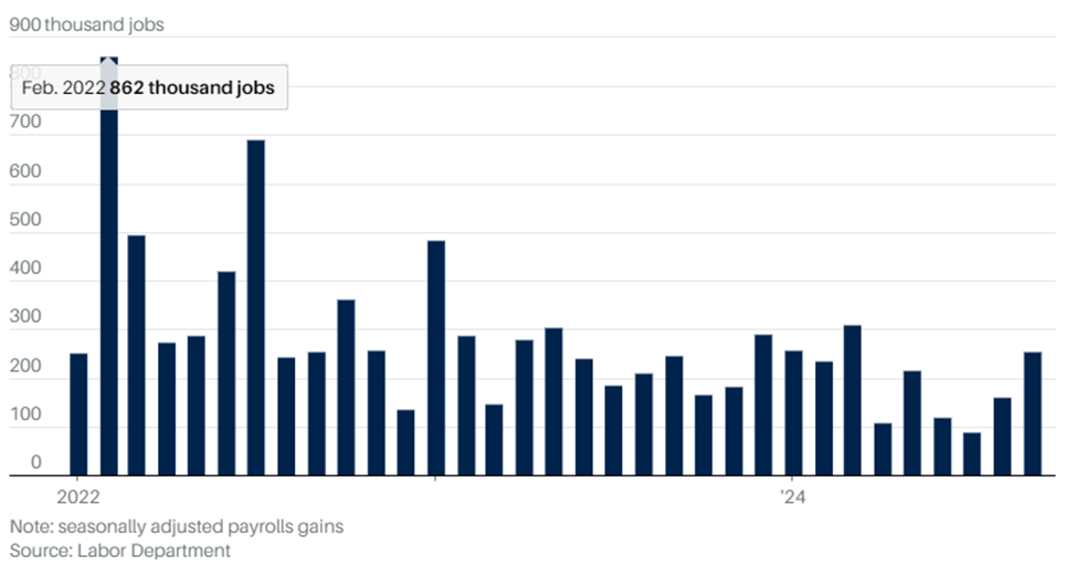 The September jobs report showed the U.S. labor market continues to beat expectations, with 254,000 jobs added, surpassing economists’ forecast of 140,000 and higher than Bloomberg's consensus estimate of 150,000. This figure was also a notable increase from the revised 159,000 jobs added in August. The unemployment rate remained stable at 4.1%, in line with expectations, but higher than the 3.8% recorded a year earlier. Average hourly earnings rose by 0.4%, or 13 cents, to $35.36, slightly above the 0.3% growth forecast. Over the past 12 months, wages have increased by 4.0%, indicating steady wage inflation.