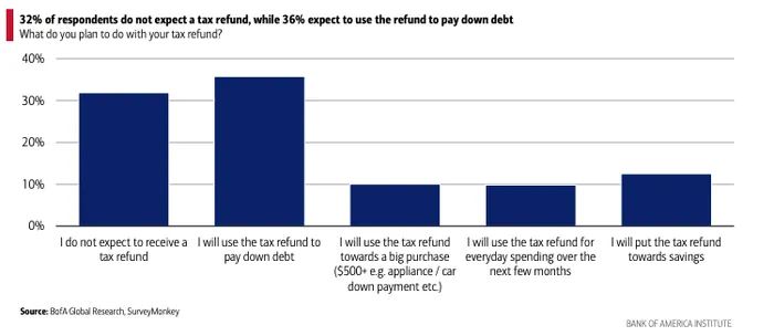 Beyond corporate earnings, fresh consumer data from the Bank of America Institute suggested tax refunds could provide a modest tailwind to household balance sheets. According to BofA Global Research’s latest payment priority survey conducted with SurveyMonkey, 36% of respondents plan to use their refund to pay down debt, while roughly 20% expect to spend it on large purchases or everyday expenses. About 32% do not expect to receive a refund.