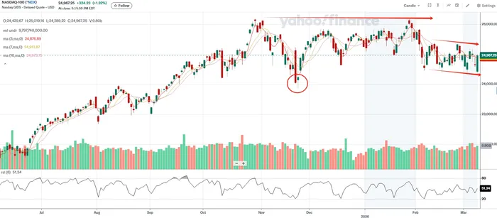 From a technical standpoint, the S&P 500 and Nasdaq 100 are displaying clear divergence under the current geopolitical tension. The S&P 500 continues trending downward, forming a classic "lower-high and lower-low" bearish structure. MA(3, 7, 10) are all trending lower, suggesting that buying the dip may not be wise until clearer signals emerge. The most important level to monitor is the 6538 area, which represents a key support zone. If that psychological level breaks, further downside pressure could appear as confidence weakens.