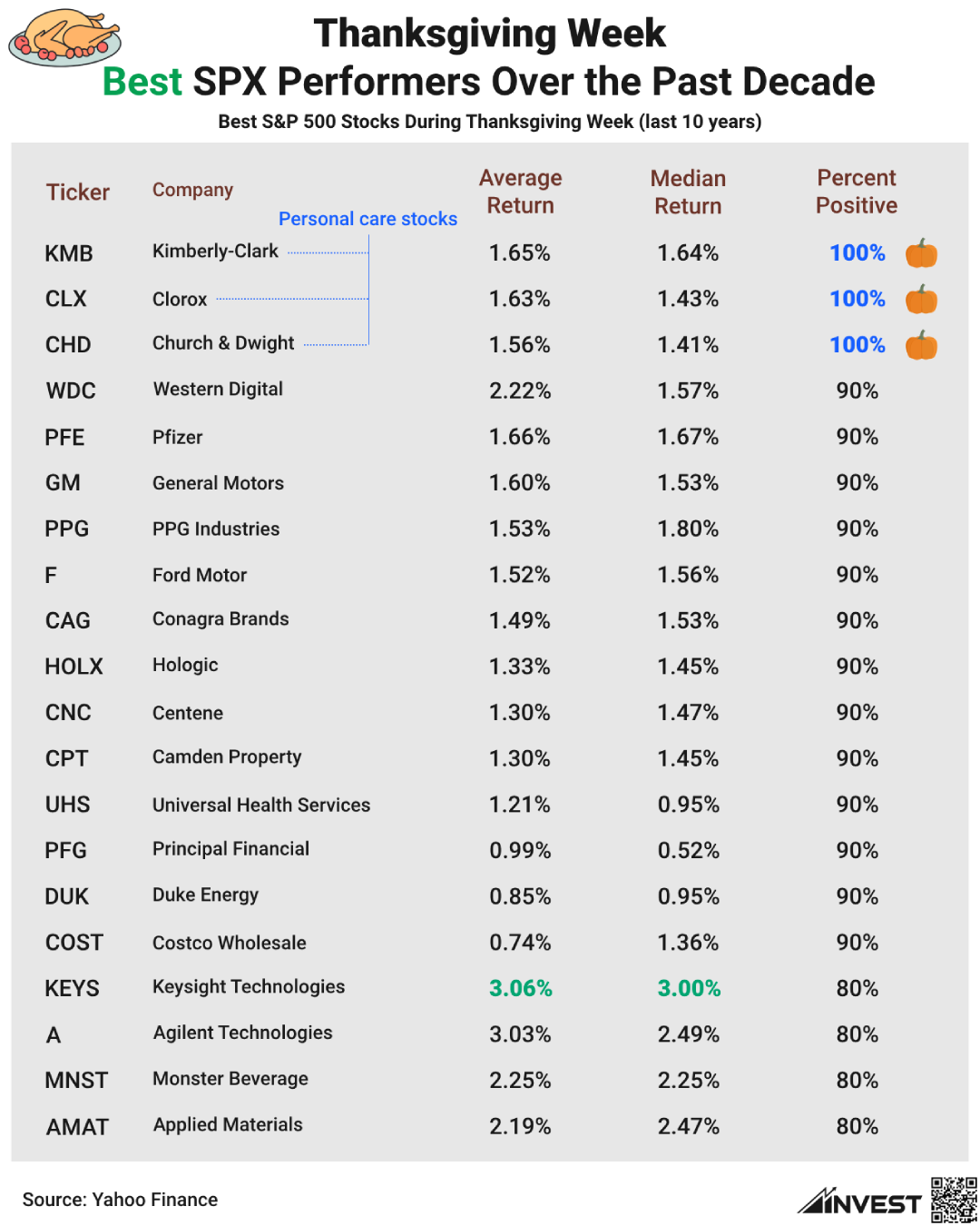 Over the past ten years, three personal care giants have dominated as top performers: Kimberly-Clark (KMB), Clorox (CLX), and Church & Dwight (CHD). These stocks have delivered positive returns every single Thanksgiving week, ranking highest by both percentage of positive weeks and average returns.