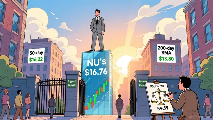 Nu Holdings' technical profile reveals a nuanced picture. The stock currently trades at $16.76, above its 50-day simple moving average (SMA) of $16.22 and 200-day SMA of $13.80, both of which signal bullish momentum. The 20-day exponential moving average (EMA) stands at $16.57, slightly below the current price, reinforcing a "Buy" signal. However, the 20-day SMA at $16.81-a key short-term benchmark-creates a conflicting "Sell" signal, indicating potential near-term consolidation.
