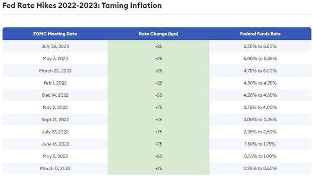 The Federal Reserve's Actions:The Federal Reserve's most recent rate hike, the seventh consecutive increase in 2022, has raised the benchmark rate 11 times to address inflation concerns. With the federal funds target rate now between 5.25% and 5.50%, the impact on the economy is evident.