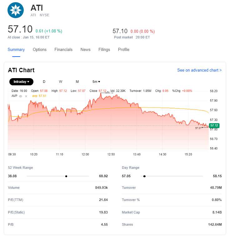 Financially, ATI is on solid ground with cash reserves of $406.6 million, translating to $2.85 per share. Its total debt stands at $1.88 billion, resulting in a debt-to-equity ratio of 98.50%. The company's EBITDA is a notable $562.90 million, and its operating cash flow is $443.50 million, offering significant liquidity for strategic endeavors.
