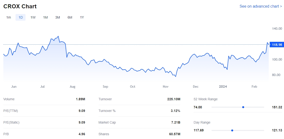 Crocs, the renowned footwear brand, delivered impressive fourth-quarter results for 2023, with its earnings per share (EPS) reaching $2.58, surpassing analysts' predictions of $2.37 by 9%. The company's revenue increased by 1.6% year-over-year to $960.1 million, closely aligning with projections of $958.39 million.