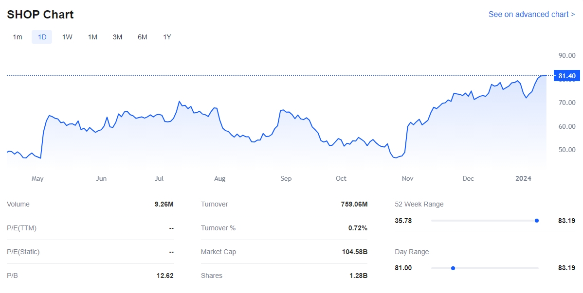 Shopify Inc., under the ticker SHOP, has emerged as a titan in the e-commerce sector, offering an all-encompassing platform and suite of services for merchants worldwide. This sophisticated platform empowers merchants to seamlessly navigate the digital marketplace through diverse channels, including web and mobile storefronts, social media integration, and physical retail spaces. Boasting a formidable market capitalization of $102.88B and an enterprise value of $99.09B, Shopify stands as a beacon in the e-commerce domain, captivating the attention of investors and market analysts.