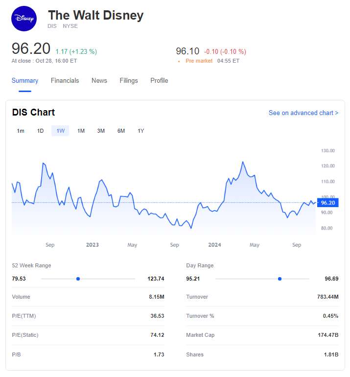 Financially, Disney holds cash reserves of $5.95 billion, translating to $3.28 per share, while its total debt amounts to $47.58 billion, resulting in a debt-to-equity ratio of 45.19%. The company posted an EBITDA of $16.75 billion, highlighting substantial earnings before interests, taxes, depreciation, and amortization.