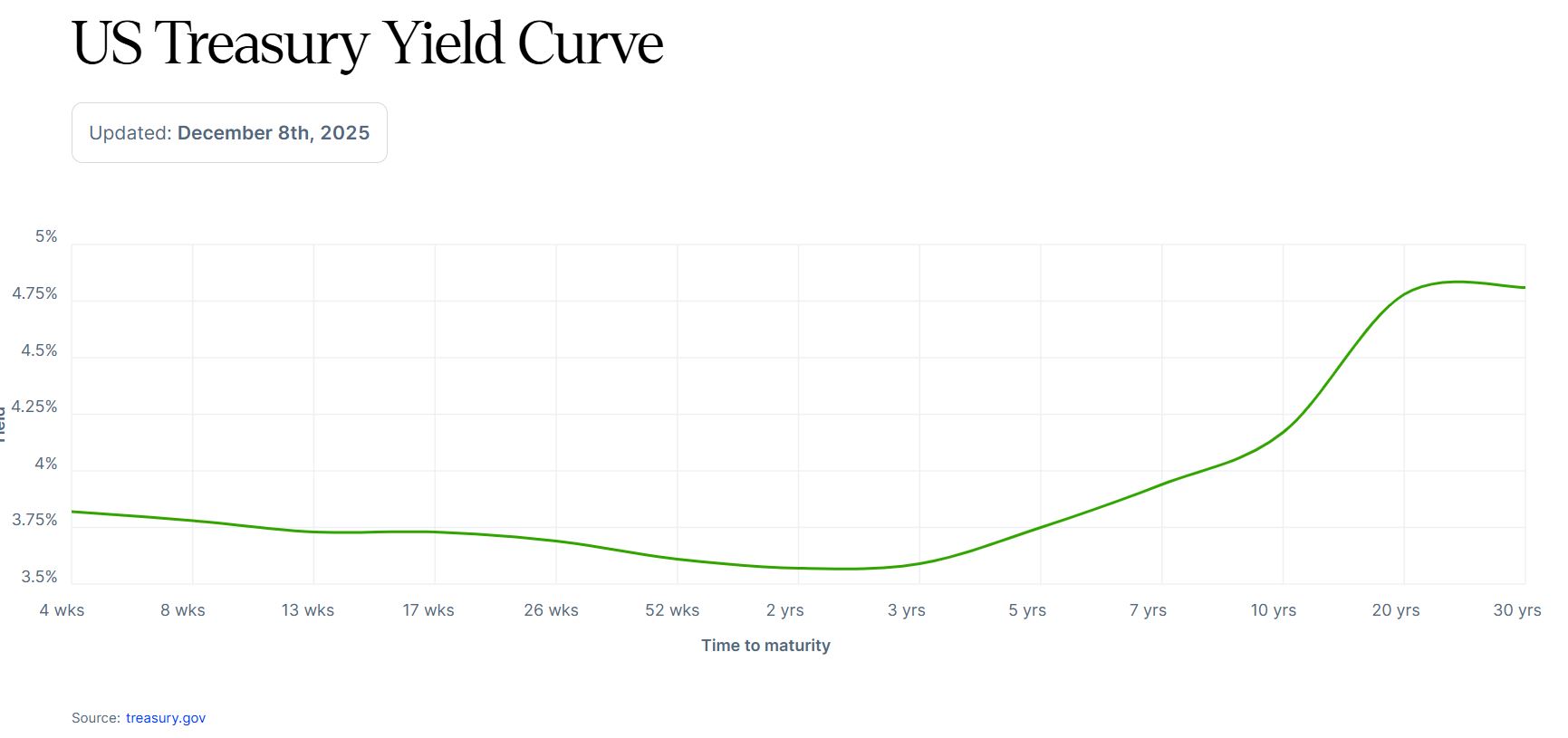 Short-term yields remain tightly anchored to Fed policy. The 2-year Treasury is hovering around 3.58%, slightly below the effective fed funds rate and largely unchanged in recent weeks. This is textbook behavior: when the Fed signals cuts, the front end of the curve listens.