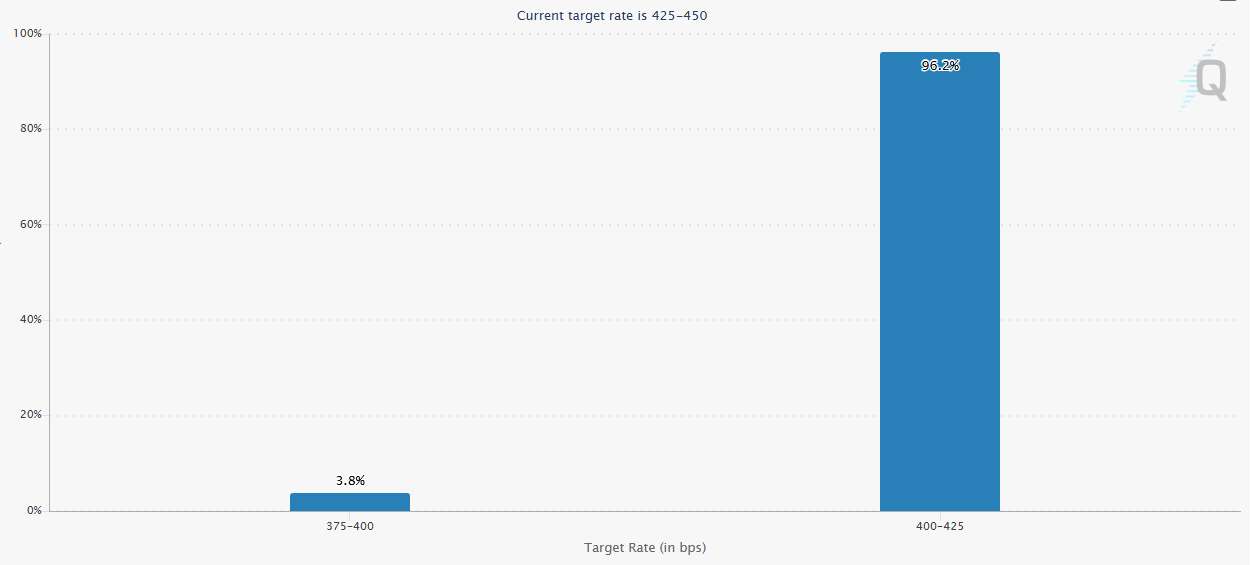 Although Trump claims the Fed will implement a "big rate cut," the likelihood of a 50-basis-point cut this week appears low. According to CME's "FedWatch Tool," the probability of a 25-basis-point rate cut this week is 96.2%, while the chance of a 50-basis-point cut is only 3.8%.