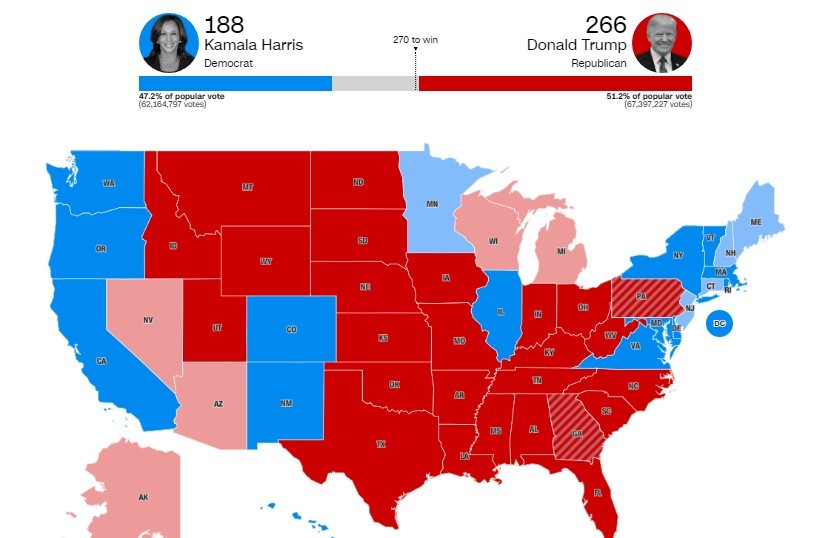 As of around 2 p.m. ET, Trump led Vice President Kamala Harris 266-188 in the electoral college, according to CNN. The focus is on key battleground states, and they are leaning towards Trump victory. Polymarket believes Trump's odds are over 99%. The former president has already won swing states of North Carolina, Georgia and Pennsylvania. He just needs 4 more votes to win the presidency.