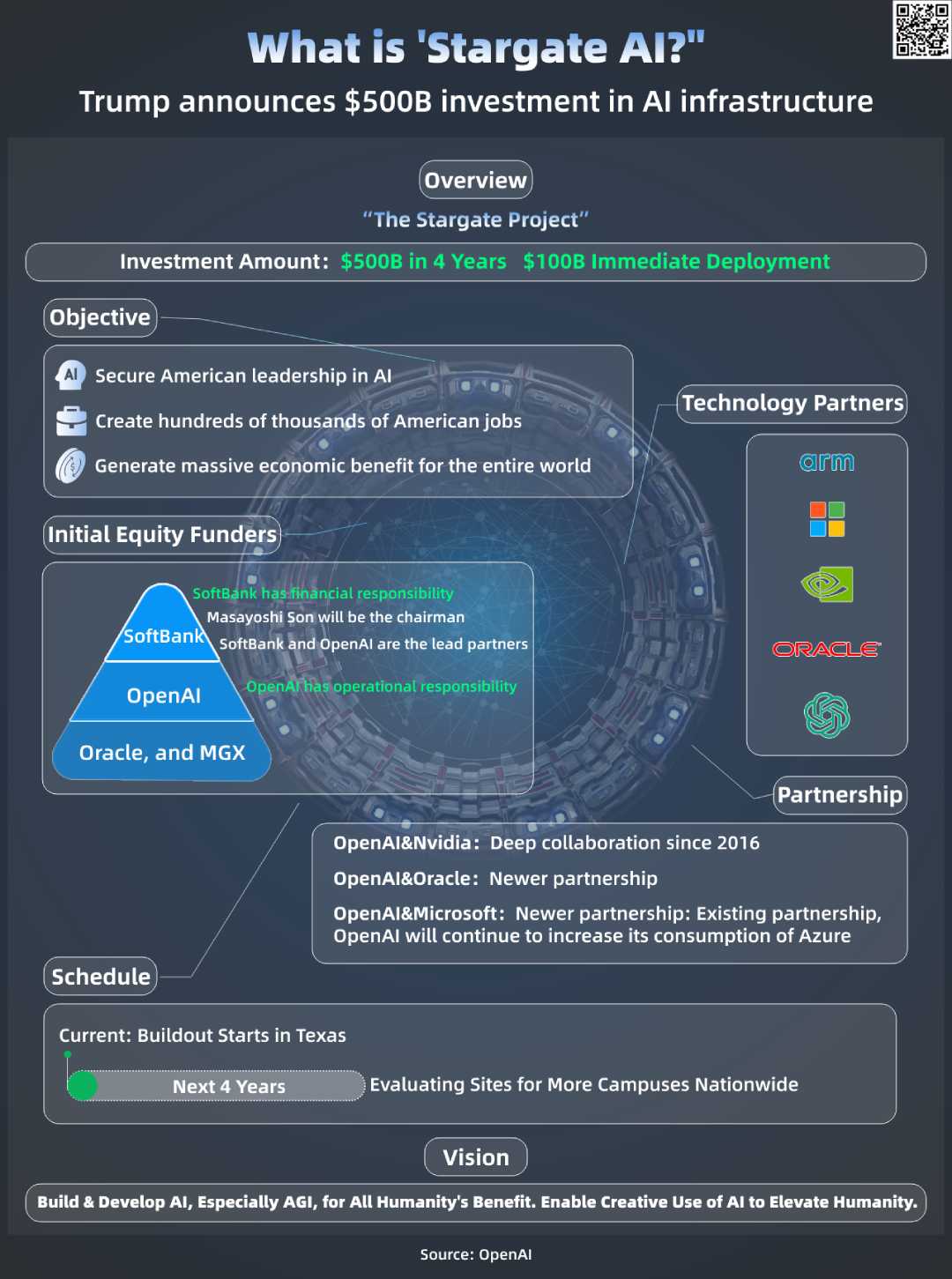 Stargate is no small undertaking. The companies involved plan to commit a staggering $500 billion to this project over the next four years, with an initial deployment of $100 billion starting right away. SoftBank, OpenAI, Oracle, and MGX are the initial equity funders, with Softbank taking on financial responsibility and OpenAI handling operations, under the chairmanship of Masayoshi Son. Key technology partners like Arm, Microsoft, NVIDIA, Oracle, and OpenAI are set to collaborate closely, building on existing partnerships such as the long-standing one between OpenAI and NVIDIA since 2016, and the newer alliance between OpenAI and Oracle.