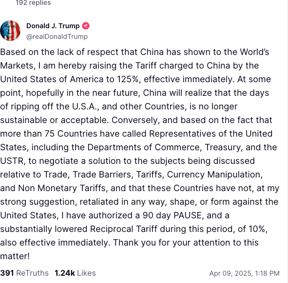 Trump Tariff Pause And Raising China to 125%