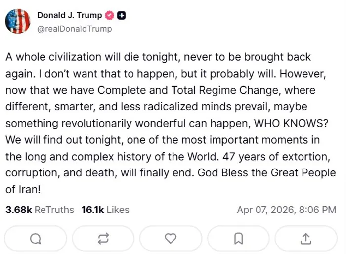 "A whole civilization will die tonight, never to be brought back again. I don't want that to happen, but it probably will," Trump posted on social media, underscoring the urgency and severity of the ultimatum.