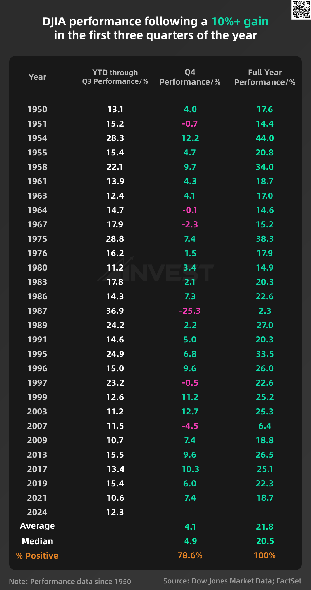 Other stock indices also show a similar pattern, including the Dow Jones Industrial Average and the Nasdaq Composite. Since 1950, the Dow Jones Industrial Average has risen more than 10% in the first nine months of the year on 29 occasions (including 2024). In these 29 instances, the Dow Jones continued to rise in the fourth quarter 23 times (except for six years), with a median gain of 4.9%.