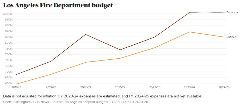 A month prior to the fires, LAFD Fire Chief Kristin Crowley sounded the alarm. City budget documents reveal a $17.6 - million (2%) decrease in the fire department's funding from the 2023 - 24 to the 2024 - 25 fiscal year. Despite the city council's November approval of a four - year, $203 - million contract with the firefighter's union, drawn from the general fund to boost staff wages and benefits, the budget cuts were taking a toll.