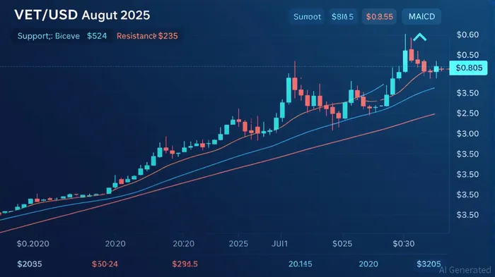 VET’s price action in August 2025 has been characterized by a tight range between $0.0216 and $0.0244, with key support at $0.0244 and immediate resistance at $0.0285 [1]. The Relative Strength Index (RSI) remains in a neutral range, suggesting the market is neither overbought nor oversold, while the MACD histogram shows early signs of bullish divergence [2]. A breakout above $0.0285 would trigger a cascade of institutional buying, with the next resistance levels at $0.0326 and $0.0359 acting as psychological barriers [1].