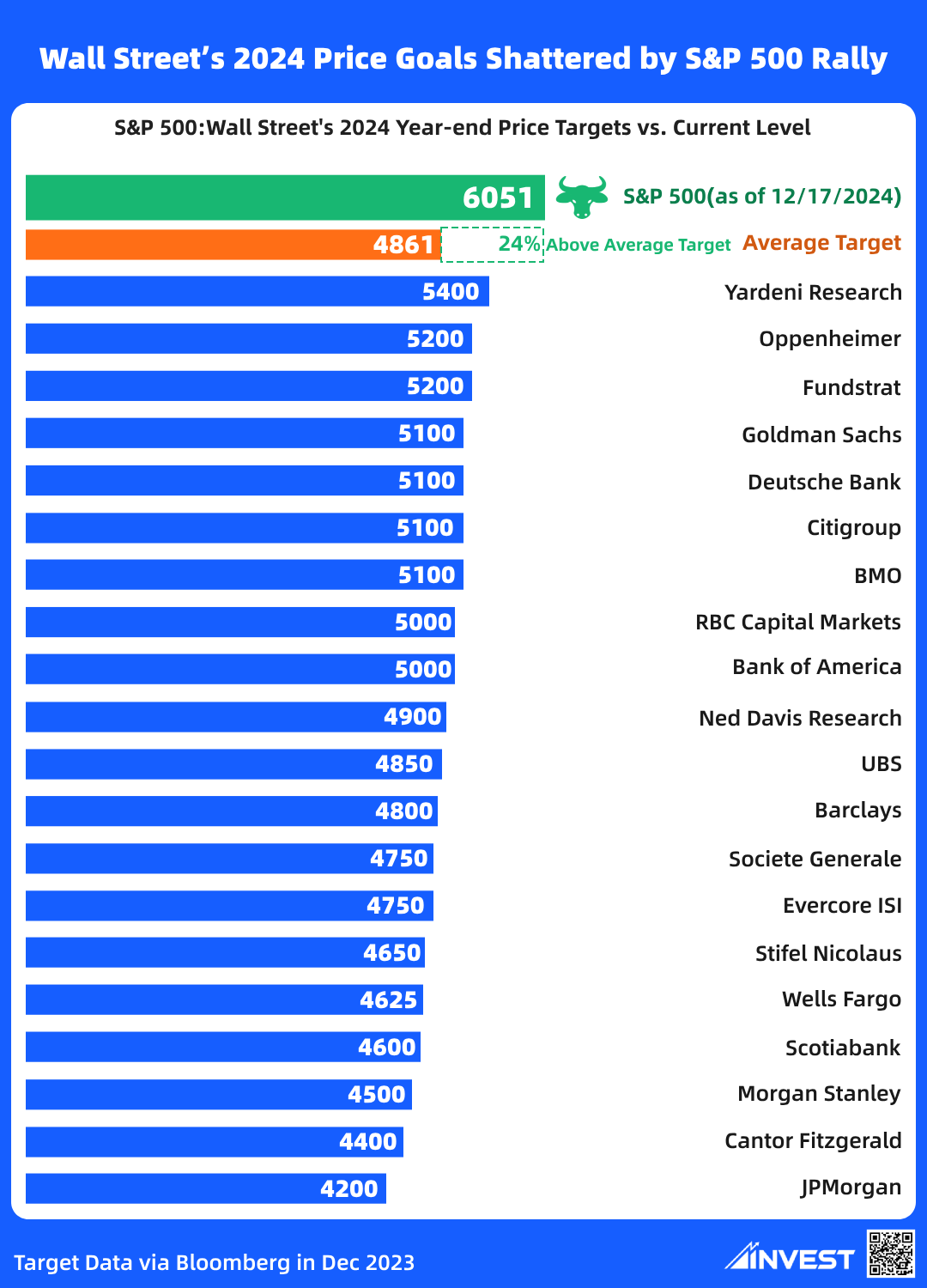 With less than two weeks left in 2024, U.S. stocks are poised to post their best annual performance in years. The S&P 500 has exceeded even the most optimistic forecasts from Wall Street analysts. As of the December 17 close, the index sits 650 points higher than the most bullish year-end target.