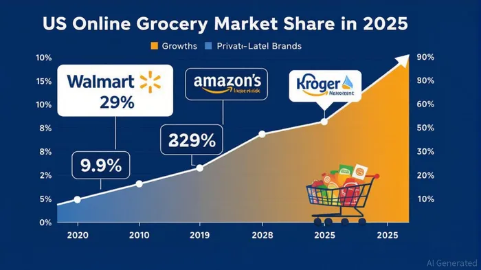 In contrast, competitors like Target (TGT) and AmazonAMZN-- (AMZN) face steeper challenges. Target's Q2 2025 in-store sales declined 5.7%, despite a 4.7% rise in digital sales, as discretionary demand softened. Amazon, while maintaining its e-commerce dominance, grapples with rising advertising costs and third-party seller margins. KrogerKR-- (KR), though smaller, has leveraged its domestic footprint and loyalty program to retain grocery customers, but its market share in online grocery (9.9%) lags behind Walmart's 29%.