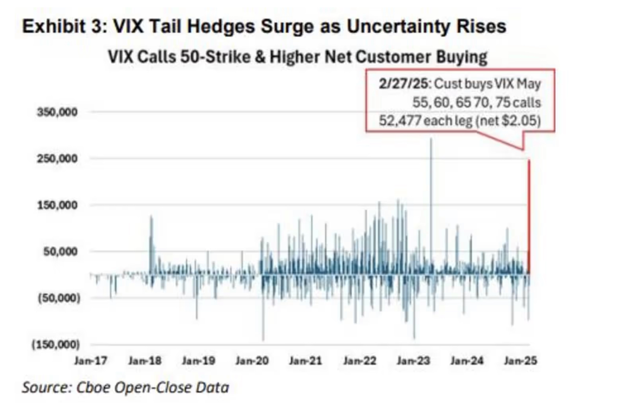 According to a Cboe report, last Thursday saw purchases of over 260,000 VIX call options expiring in May with strike prices between 55 and 75, amounting to a total cost of $10.7 million. A Cboe representative noted that this was the second-highest volume day ever recorded for high-strike (50+) VIX call options. Net customer purchases of deeply OTM VIX calls soared to nearly 250,000 contracts, marking the largest one-day transaction volume since May 4, 2023.
