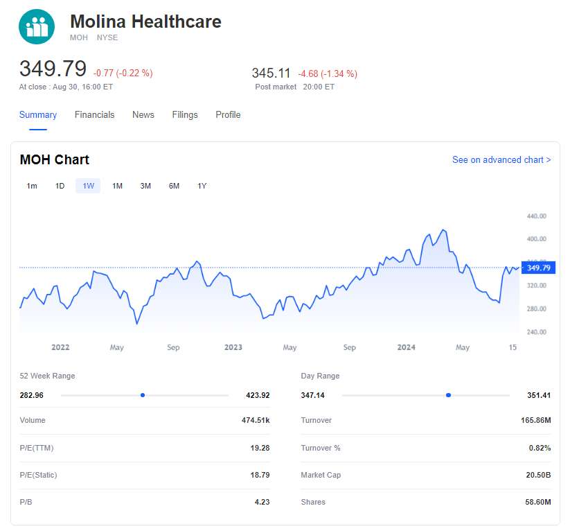 Molina Healthcare, Inc. (MOH) is currently trading at $349.79 per share, with a median target price of $376.00. Analysts generally recommend a "hold" rating for this health services company.