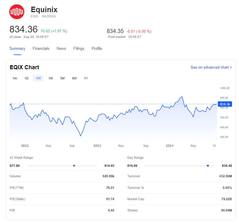 Equinix, Inc. (EQIX) is currently trading at $834.36 per share, with a median target price of $935.50. Analysts recommend a "buy" position for this prominent data center company.