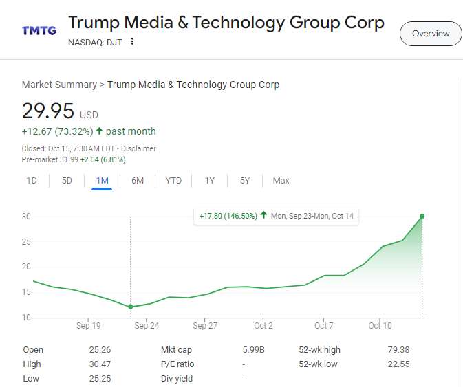 In fact, on September 23, DJT's stock price plummeted to a historical low of $12.15, an 82% drop from its peak. However, in the three weeks following, the stock price more than doubled. It rose nearly 50% just last week, and on Monday, it increased by 20% again, with a gain close to 150% since September 23. On Tuesday's pre-market, as of press time, DJT once again delivered a nearly 7% increase.