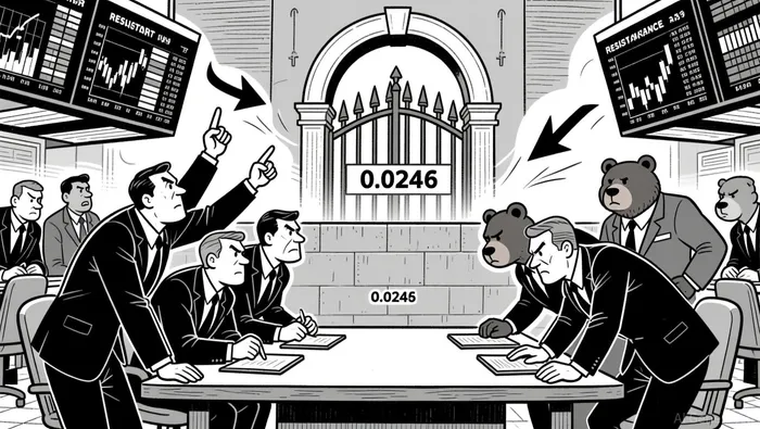 Short-term moving averages (20 and 50-period) on the 5-minute chart remain flat, indicating no clear directional bias. The 50-period MA sits near 0.0248, acting as a dynamic pivot point. No major deviation from longer-term averages is observed.