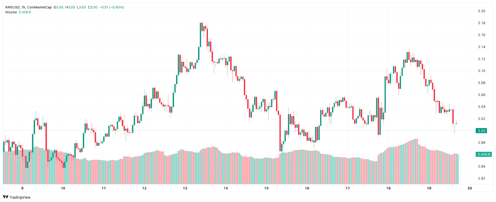 XRP is trading just above $3.00 after multiple failed attempts to break resistance at $3.10. The pattern has turned visibly bearish, with analysts warning of further downside if key support levels collapse. According to TradingView, XRP has now formed a lower high, and volume on rebounds continues to fade — a classic warning sign that momentum is weakening.