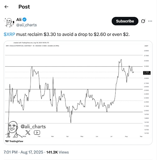 Analyst Ali Martinez noted that XRP’s momentum is fading and that losing $3.00 could trigger a steep correction.